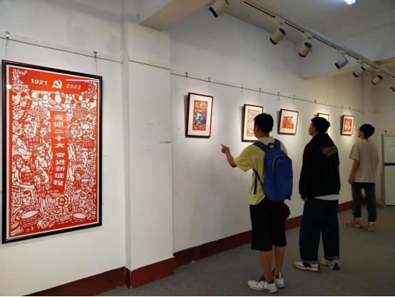 中国剪纸又称中国刻纸,是用于装点生活或配合其他民俗活动的民间艺术;中国红,最饱含光明与希望的颜色。在展厅里展出的30多幅优秀作品里,天安门、长城、党徽、党旗、廉政图形图案、习近平总书记头像等和“热烈庆祝党的二十大胜利召开”、“向党的二十大献礼”、 “同心向党,共筑未来”等字样最为醒目。一幅幅红艳艳的剪纸作品构图精美,主题突出,看上去庄重又喜庆又不失活泼,充分展现出学子对党、对祖国的热爱之情与昂扬向上的精神面貌。