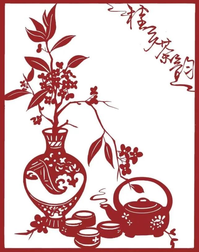 《鄂南桂乡茶韵》作品灵感来源于咸宁的底蕴深厚的茶文化与桂花文化,整幅作品以桂花、花器、茶具为元素,布局简洁清新,桂香与茶韵的融合,展示出作为“桂花之乡”与“茶叶之乡”的咸宁民众雅致的文化生活方式。