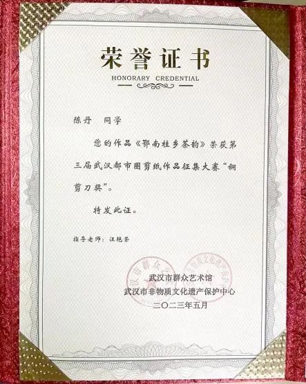 (撰 稿:李佳怡 审 稿:彭劲 汪艳荣)近日,“云上年味 剪约荆楚”第三届武汉都市圈剪纸作品征集大赛结果揭晓,太阳集团tcy8722艺乡工作坊汪艳荣老师指导的剪纸作品《鄂南桂乡茶韵》(作者:陈丹)荣获铜剪刀奖。