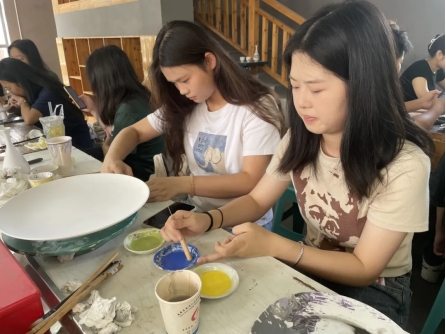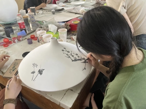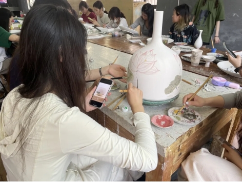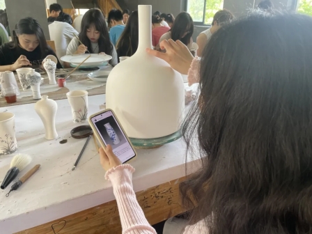 在任课老师韦桂来、许前哨两位老师的带领下,同学们先观摩了“情系桑梓 美在家山——董继宁中国画陈列展”,随后到记山窑开展了两个上午的“瓷上绘画”教学活动。在学习的过程中,得到了董继宁教授的亲自指导。美术系黄碧波、艾应栩、陈冲、陈红霞四位老师,也给同学们做了示范。同学们在几位老师的共同辅导下,获得了很大的进步,也画出了多幅瓷上绘画作品,我们期待作品烧制出来的效果。