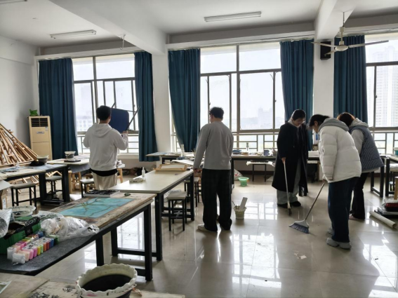 清洁过程中,学生党员、团员及学生会成员充分发挥先锋模范作用,主动认领卫生死角清理、仓库杂物归置等难度较大的任务。全体参与人员服从现场统一安排,严格落实清洁标准,对教室桌椅、门窗、地面进行全面擦拭清扫,对考研自习室的书籍、物品进行规范整理,对仓库的画架和地面进行整理摆放与除尘清洁。活动现场秩序井然,同学之间相互配合、互帮互助,高效完成各项清洁任务,充分展现出艺院学子强烈的集体归属感与团队协作能力。