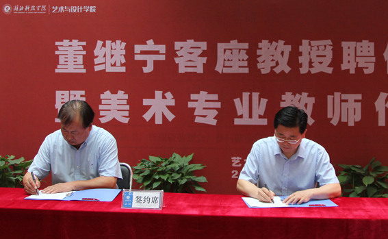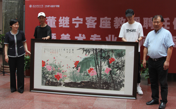 董继宁深情回顾了自己曾经在咸安校区求学的经历,他表示,为湖科艺术学院的学科建设与发展贡献自己的力量,是历史的注定,是个人的愿望。并将全部捐赠客座教授的薪资用于学科建设,资助贫困学子求学。活动现场,董继宁教授向学校捐赠个人画作。