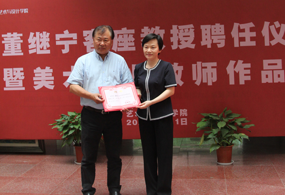 本网讯 5月11日上午,学校在我院教二大厅举行董继宁教授聘任仪式暨美术专业教师作品展,著名山水画家董继宁教授受聘为我校客座教授,为我学科建设赋能。校党委书记闫英姿向董继宁颁发聘书并致辞。校办主任殷燕子、人事处处长刘金雄、科研处处长周燕红、宣传部部长黎鸿翔、教务处副处长钱爱林及我院领导和全体师生出席,聘任仪式由校办主任殷燕主持。