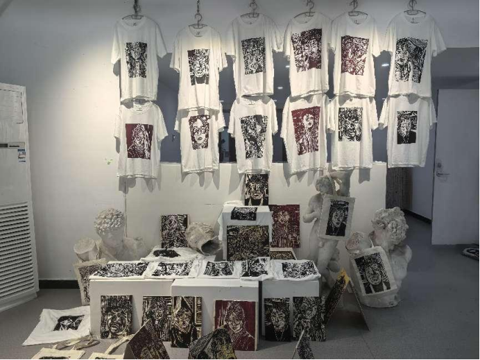 展览作品充分体现了传统与创新的交融。书法作品笔锋遒劲,在传承经典中注入现代审美;国画或以写意山水勾勒空灵意境,或以工笔人物刻画细腻神韵;水彩画通过水色交融的技法,营造出灵动清新的画面;油画以厚重的质感和层次分明的色彩传递情感深度;版画则借助黑白对比与线条张力,在T恤等现代载体上迸发视觉冲击力。此外,扎染作品融合传统工艺与当代设计,综合材料创作突破媒介限制,展现了学生大胆的艺术实验精神。