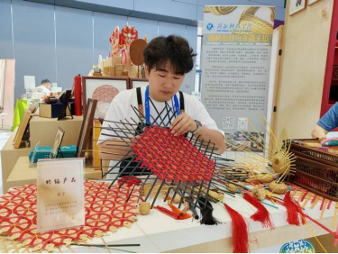 展会期间,湖科布谷鸟非遗工坊在湖北馆设立非遗竹艺体验区,现场演示非遗竹编传统技艺。我校太阳集团tcy872221级学生、非遗传承人李林涛,与指导老师同台,以灵巧的双手将竹材化作艺术品,吸引众多观众驻足观赏、互动体验。这一过程不仅展示了非遗技艺的精妙,更表达了竹文化在师生间的创新传承。