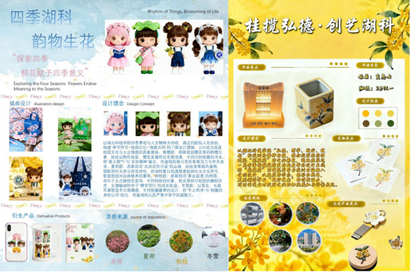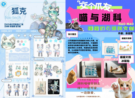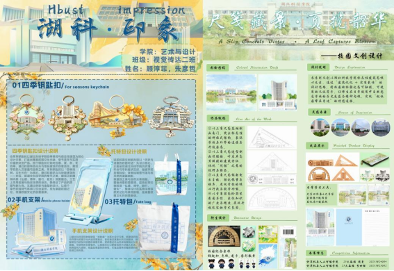本次大赛从9月份启动以来,学院精心组织,邀请专业老师制定评分细则并完成作品初选,随后为入围者开展培训、提供修改意见,鼓励学生将文创与科技融合,深入挖掘校园文化资源,创作兼具创新性、实用性和文化内涵的湖科特色作品。在师生共同努力下,一批充满巧思的作品应运而生:一等奖作品《湖科·印象》和《尺笺藏景·页揽韶华》以校园建筑与四季风物为灵感,通过实地采风和文献梳理打造贴近生活的纪念品;《喵与湖科》《狐克·fox-tech》聚焦校园动物,以设计符号凝结温馨互动;《雅韵湖科·栀月佩》则融合传统工艺与校园自然元素。此外,透卡系列、便携地标设计等作品均源于对校园的真挚观察与匠心转化。这些作品不仅定格了湖科风貌,凝聚了学子深情,也为学校文化建设和对外宣传注入新活力,提升了学校的文化影响力。